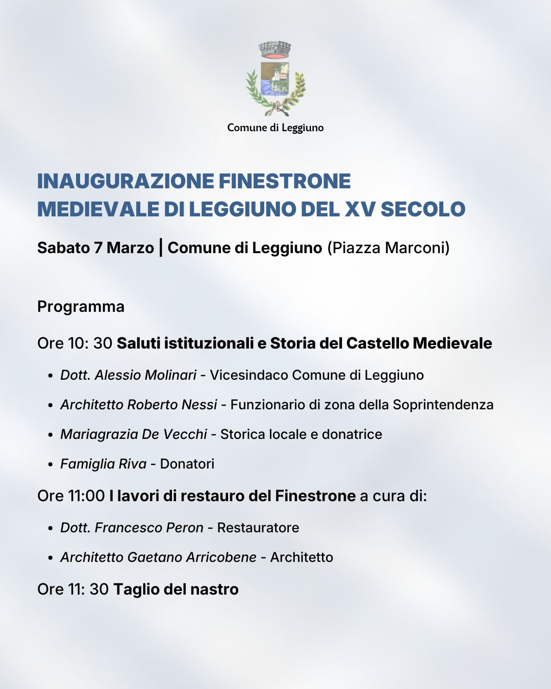 Invitiamo tutta la Cittadinanza alla cerimonia di inaugurazione per condividere questo momento importante per la storia leggiunese.